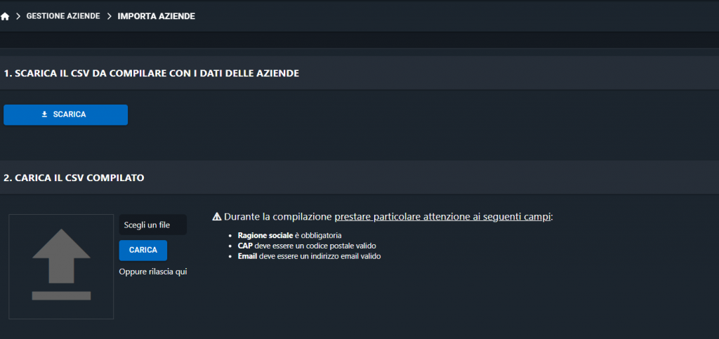 Sulla pagina Gestione Aziende è presente un nuovo bottone “importa aziende”, cliccando sopra si aprirà una pagina dove è possibile scaricare il file .csv. Dopo aver compilato il file, è possibile caricarlo nella stessa pagina attraverso il bottone “carica”
